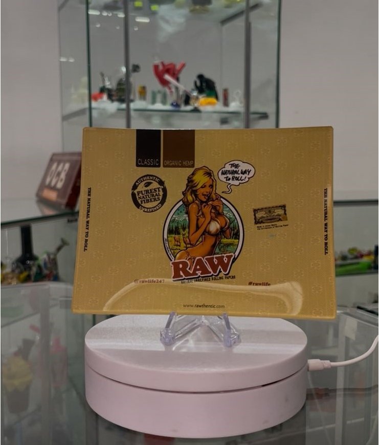 Con el icónico lema «The Natural Way to Roll», esta charola combina funcionalidad de alta gama con un diseño que nunca pasa de moda. El fondo color tabaco claro, con el patrón del logo de RAW, hace que el arte de la RAW Girl resalte de manera espectacular.