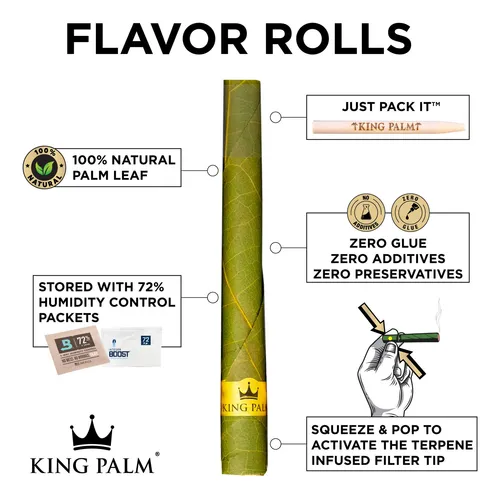 No hay nada peor que un wrap seco y quebradizo. King Palm soluciona esto incluyendo un paquete de humedad Boveda (control de humedad de 2 vías) dentro de cada bolsa resellable. Esto mantiene tus conos en el nivel exacto de humedad (62%) desde que salen de la fábrica hasta que los abres, asegurando que la hoja esté siempre flexible y fresca.
